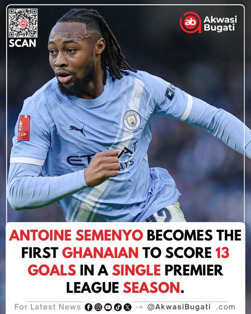 Manchester City forward Antoine Semenyo became the first Ghanaian to net 13 goals in one Premier League campaign on February 11, 2026, scoring against Fulham to break Tony Yeboah’s longstanding record of 12 (set in the mid-1990s and equaled by André Ayew in 2015/16). The 26-year-old Black Stars star, who joined City mid-season from Bournemouth, reached the landmark in a dominant display that included a goal and assist. Ghanaian fans erupted in celebration online, praising his consistency and growth after falling just short with 11 goals last term. The feat underscores Semenyo’s emergence as one of Africa’s top talents in the EPL.