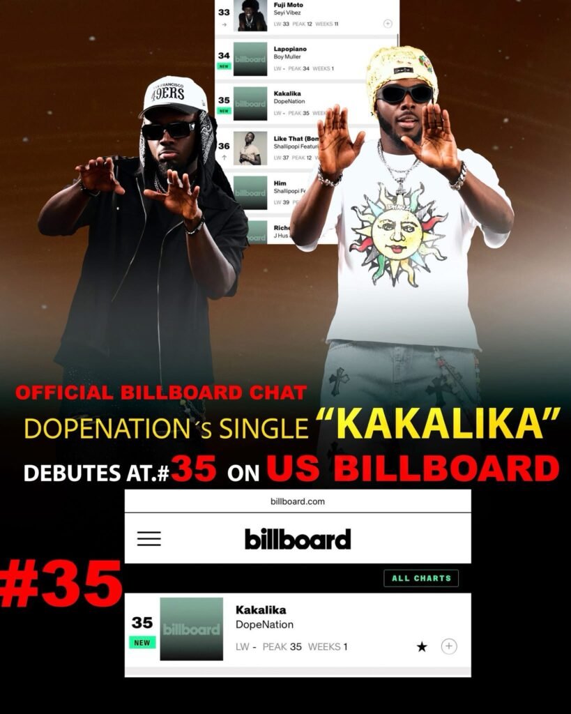 Ghanaian duo DopeNation’s infectious track “Kakalika” has achieved a major milestone by debuting on both the Billboard U.S. Afrobeats Songs chart at No. 35 (for the week dated February 7, 2026) and the Official UK Afrobeats Chart at No. 13 (for the week of January 31–February 6, 2026). This marks their first-ever entry on the U.S. Billboard Afrobeats chart!